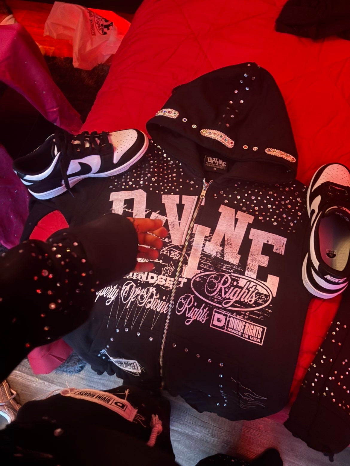 JACKET: Premium 400 GSM 100% cotton zip-up jacket featuring intricate screen printing and sparkling rhinestone embellishments. The heavyweight fabric provides unmatched warmth and a luxurious feel, with a thick, durable construction built to last. Each piece is a statement of refined style.